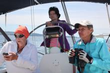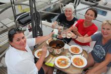 Die nächsten 3 Tage hatten Silvia, Elke, Belinda und Renee als erste Crew an Bord die tolle Chance, Hafen- und Segelmanöver mit Bettina üben zu können. Nach dem Frühstück wurde das Boot vorbereitet zum Ablegen. Wir hatten bei herrlichstem Segelwetter und gutem Wind dank vorzüglicher und geduldiger Erklärung von Bettiina das Halsen fast schon im „linken Finger“. Am nächsten Tag übten wir Hafenmanöver. Längs eindampfen in die Vorspring auf der Backbord- und Steuerbordseite und Anlegemanöver mit Heck. Rene war fest entschlossen, aus Mangel an Erfahrung bei den Hafenmanövern nicht mitzumachen. Diese Entscheidung wurde schnellstens über „Bord“ geworfen. Nach erfolgreichem An- und Ablegen waren Renee und Belinda total begeistert. Der Yugo ließ nicht auf sich warten und hat uns am 3. Tag schon ein wenig seine Stärke bewiesen. Nochmals Anlegemanöver mit Heck zum Steg. Der Manöverschluck war nach getaner Arbeit gerechtfertigt. Am 6. Juni kamen Veronika und Andrea hinzu, die zusammen mit Renee und Silvia die restliche Trainingszeit absolvierten. Bettina, Elke und Belinda mußten sich leider verabschieden.